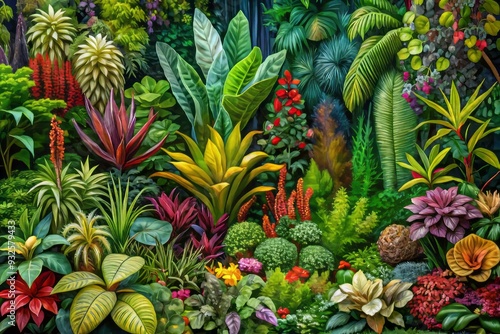 Exotic plant life overflows in a vibrant garden, showcasing intricate patterns, layered textures, and rich colors in a stunning botanical tapestry.