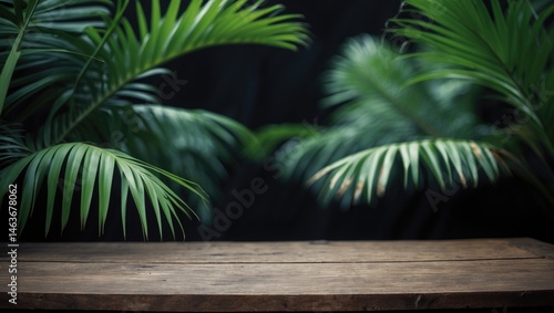 Exotic wooden surface adorned with vibrant palm leaves against a rustic background