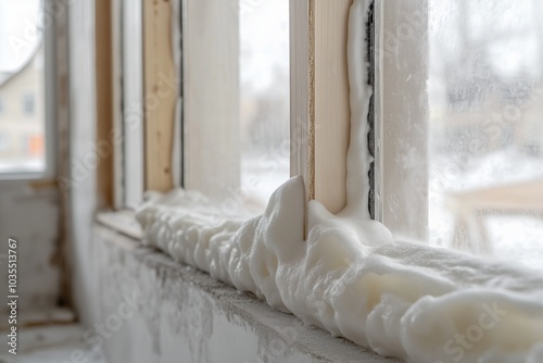 Expanding spray foam filling a gap between surfaces, demonstrating its use for insulation and sealing