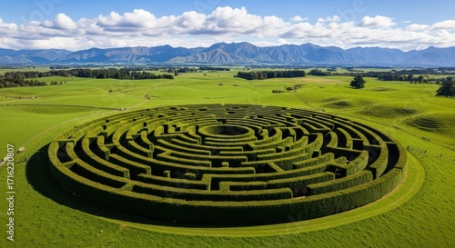 Expansive Circular Hedge Maze Amidst Lush Green Fields Under a Blue Sky
