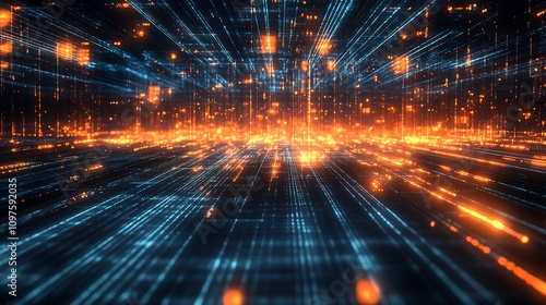 Expansive Cyberspace with Radiant Orange and Blue Neon Grids : Generative AI