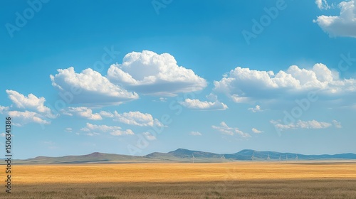Expansive Golden Field Under Bright Blue Sky with Fluffy Clouds and Distant Mountains Enhancing the Beauty of a Serene Rural Landscape