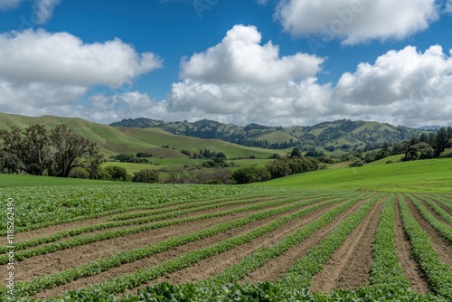 Expansive Green Fields with Rows of Vegetables Under Bright Blue Sky and Fluffy White Clouds in Scenic Agricultural Landscape