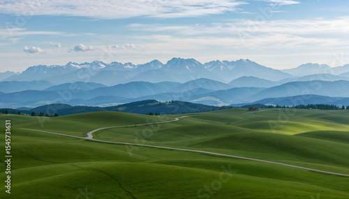 Expansive Green Meadow with Distant Mountain Range in Clear Weather