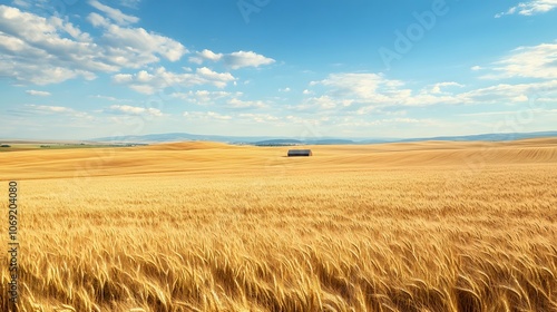 Expansive rolling fields of golden wheat stretch out under a bright blue sky, with a distant barn visible on the horizon
