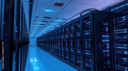 Expansive server room with rows of interconnected data cabinets, glowing with internal lights, reflecting on a polished floor