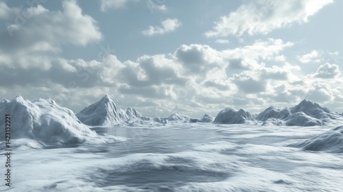 Expansive snowy landscape with snow-covered mountains and cloudy sky