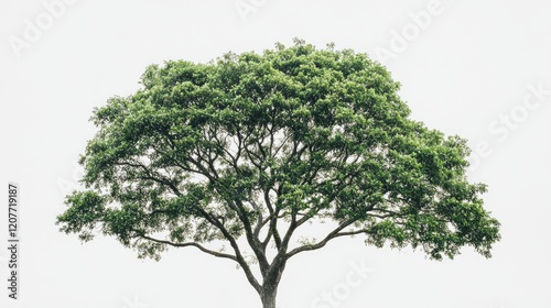 Expansive tree silhouette with lush green leaves against a neutral white backdrop, capturing intricate branch details and overall symmetry.