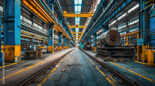 Expansive view of an industrial factory with wide aisles, overhead cranes, and machinery, highlighting manufacturing infrastructure.