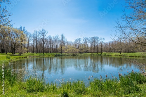 Expansive water body encircled by lush greenery. Outdoor camping scene. Seasonal scenery with clear skies.