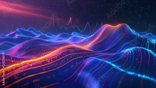 Experience a captivating abstract cyber scene featuring mountainous waves illuminated in vibrant colors, creating a stunning visual display that evokes a sense of serene adventure at night.