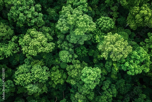 Experience a drone's eye view of a verdant forest teeming with green trees, showcasing abundant foliage capturing CO2