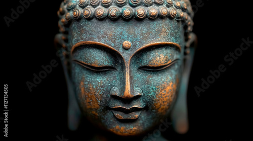 Experience serenity through the enchanting face of a Buddha statue captured in exquisite detail against a striking black background, showcasing the essence of impressionism