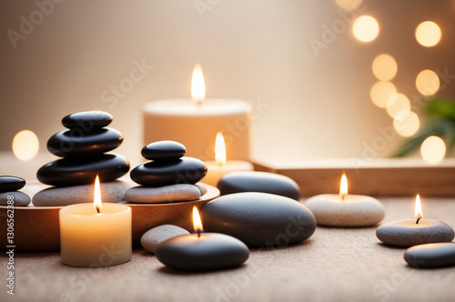 Experience tranquility with smooth, stacked stones and softly glowing candles, creating a zen atmosphere.