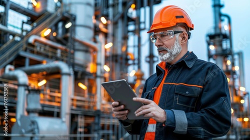 Experienced male technician operating tablet at gas refinery installation during evening twilight