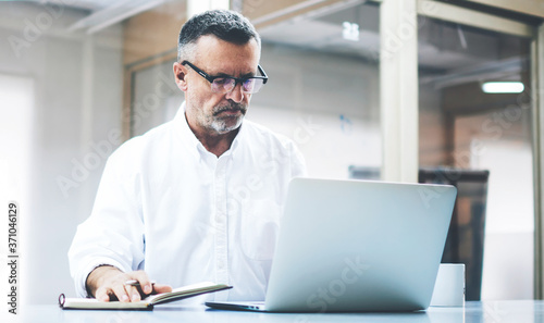 Experienced mature businessman uses a laptop computer and notebook to check the work in production. Skilled finance manager typing information on keyboard while working on a new project in the office