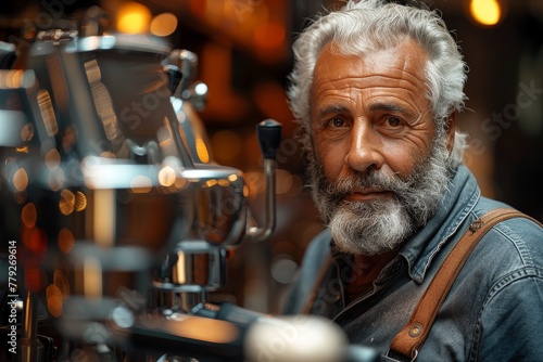 Experienced older barista with a beard standing by an espresso machine