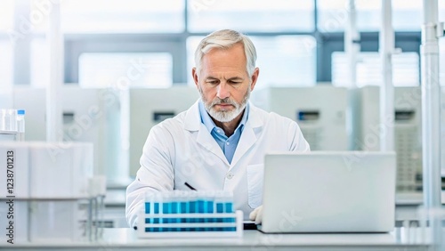 Experienced Scientist Analyzing Data in Modern Laboratory Setting with Test Tubes and Laptop