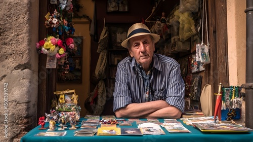 Experienced Vendor Sells Unique Souvenirs and Local Crafts at a Charming Street Stall