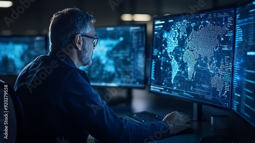 Expert analyzing global data on multiple screens in a high-tech control room, showcasing innovation and technology.