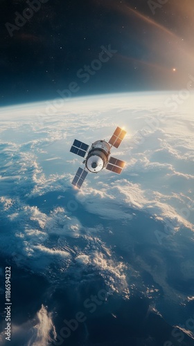 Exploration in motion as a satellite orbits Earth under a radiant sunlit sky. Generative AI