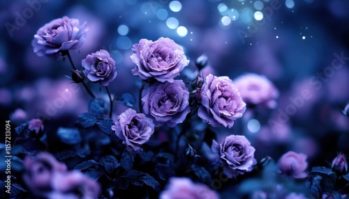 Explore a romantic vignette of roses with a blurred background, capturing their elegance and gentle fragrance in this floral artwork The scene unfolds with delicate purple hues, soft focus effects