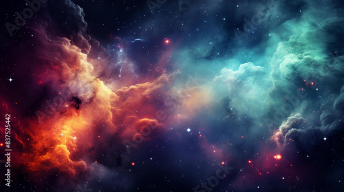 Explore a stunning artistic space nebula composition with vibrant colors in this flat illustration featuring detailed textures and seamless patterns.