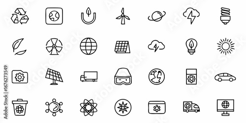 Explore a versatile collection of modern eco-friendly icons showcasing renewable energy, sustainability, and environmental protection for impactful design projects