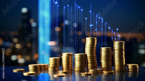 Explore 'Rising Fortunes': stacked coins and candlestick graphs against a cityscape, revealing business, stock market, and trading insights. A visual showcase of finance and economic trends