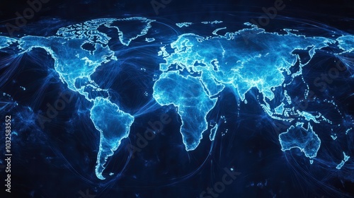Explore the blue world map adorned with a captivating glow of the global network light.