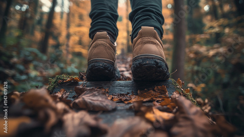 Exploring a forest path in autumn with rugged boots on a fallen log.