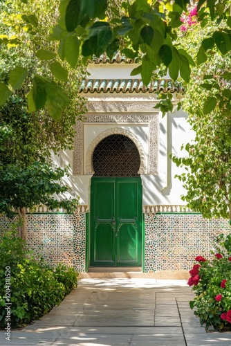 Exploring a serene garden pathway leading to a beautiful green door surrounded by vibrant plants and intricate tile work in a historic location