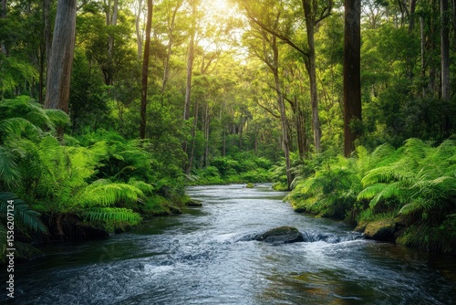 Exploring a tranquil river flowing through the lush tropical jungle wilderness of Tasma, River in tropical jungle forest Wilderness of Tasmania and nature destinations