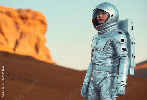Exploring mars astronaut in spacesuit on red planet surface space travel adventure mission