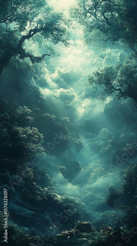 Exploring Mystical Forest with Foggy Light Streaming Through Trees