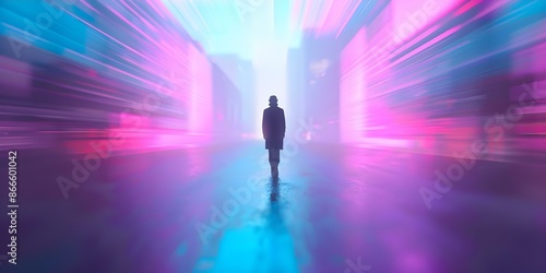 Exploring the Metaverse A Man in a Surreal Cityscape against a Colorful Background. Concept Metaverse Exploration, Surreal Cityscape, Colorful Background, Man Portrait, Digital Technology