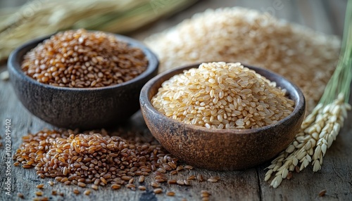 Exploring the nutritious benefits of brown rice and whole grains in a rustic kitchen setting