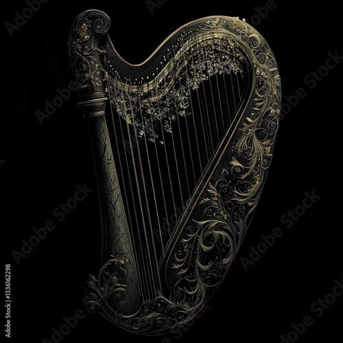 Exquisite ornate harp showcasing intricate craftsmanship and detailed design in a dramatic lighting setup