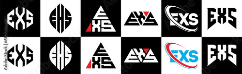 EXS letter logo design in six style. EXS polygon, circle, triangle, hexagon, flat and simple style with black and white color variation letter logo set in one artboard. EXS minimalist and classic logo