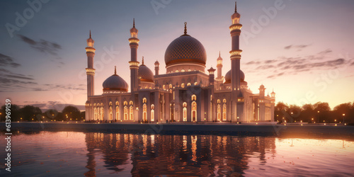 Exterior of a beautiful ornate muslim religious mosque at sunset. Generative ai