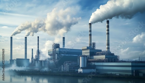 Exterior shot of a modern manufacturing plant with smoke stacks and industrial structures. ,