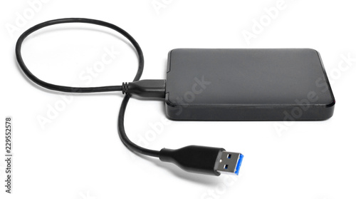 External hard disk with cable, isolated on white background. Small modern hard drive, PC security.