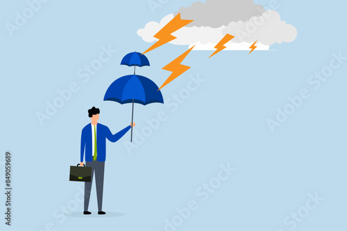 Extra protection for thunderstorm ahead, businessman holds a double layer umbrella to protect against the storm.