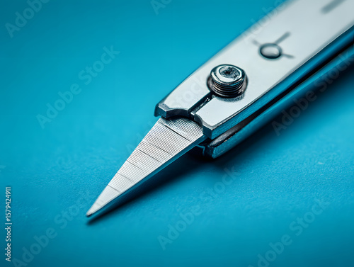 Extreme close up of a sharp metal craft knife blade on a blue background