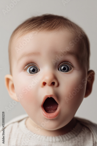 Extreme close-up portrait of a surprised baby with wide-open eyes and mouth, expressing amazement or shock. Photorealistic skin texture, soft light, head and neck only, neutral background.