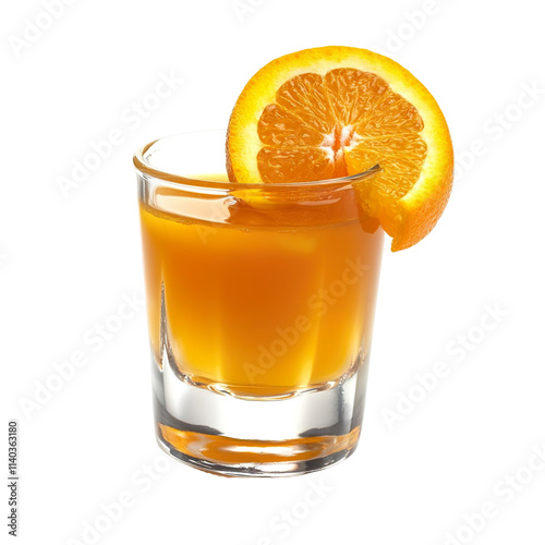 Extreme front view of a perfect looking Orange Liqueur Shot isolated on a white transparent background