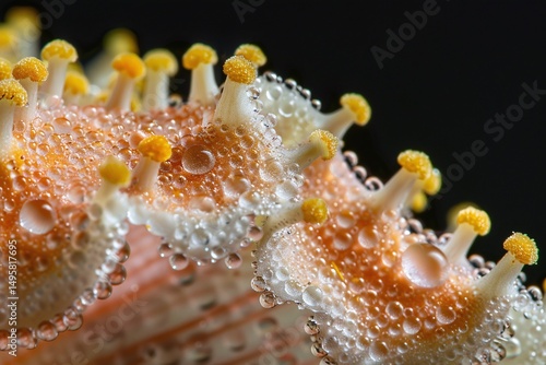 Extreme Macro Photography of Flower's Pollen Grains on a Petal with Dew Drops and Dark Background Varient 2