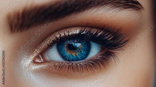 Extremely long false eyelashes on a female eye. Extensions for eyelashes. Beauty, cosmetics, and makeup. Macro, up close.
