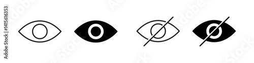 Eye Icons Vector Set, Black Silhouettes with Pupil, Crossed-out Eye for Privacy, Seen/Unseen, Show/Hide, and Vision Symbol Designs on White Background.