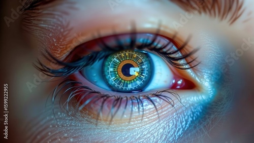 Eye with intricate digital patterns symbolizes innovation and technology, showcasing future of women in blockchain industry